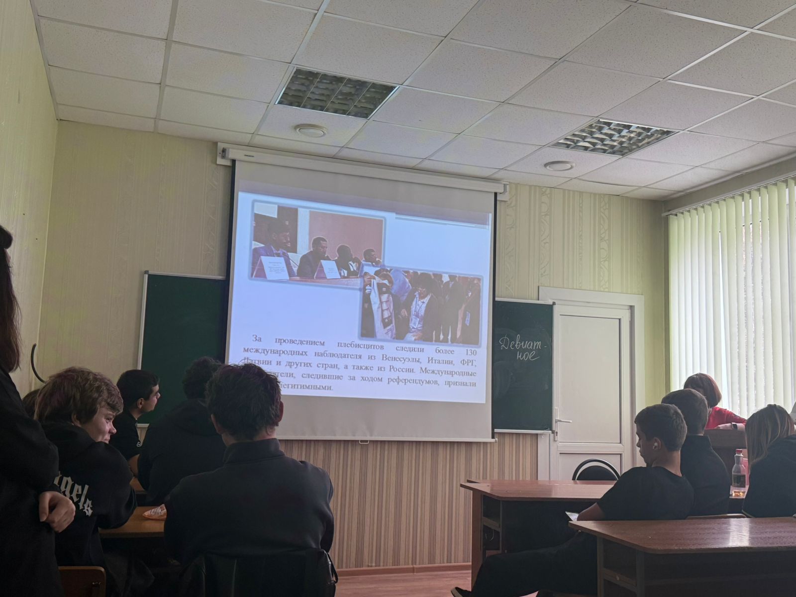 В ходе мероприятия обучающимся была показана презентация на данную тему: что привело эти Республики в состав Российской Федерации, когда и как все начиналось, когда были приняты основные указы.