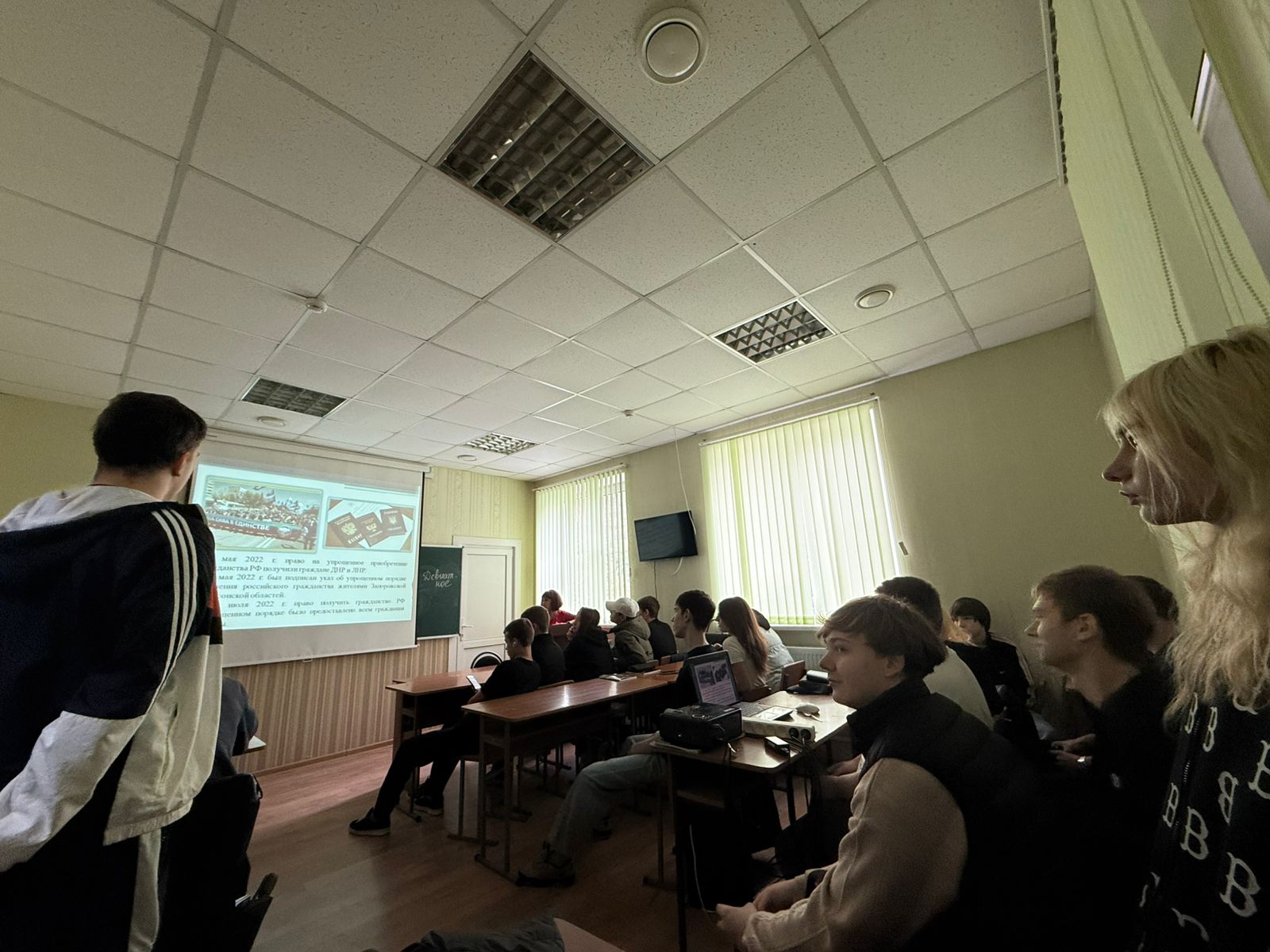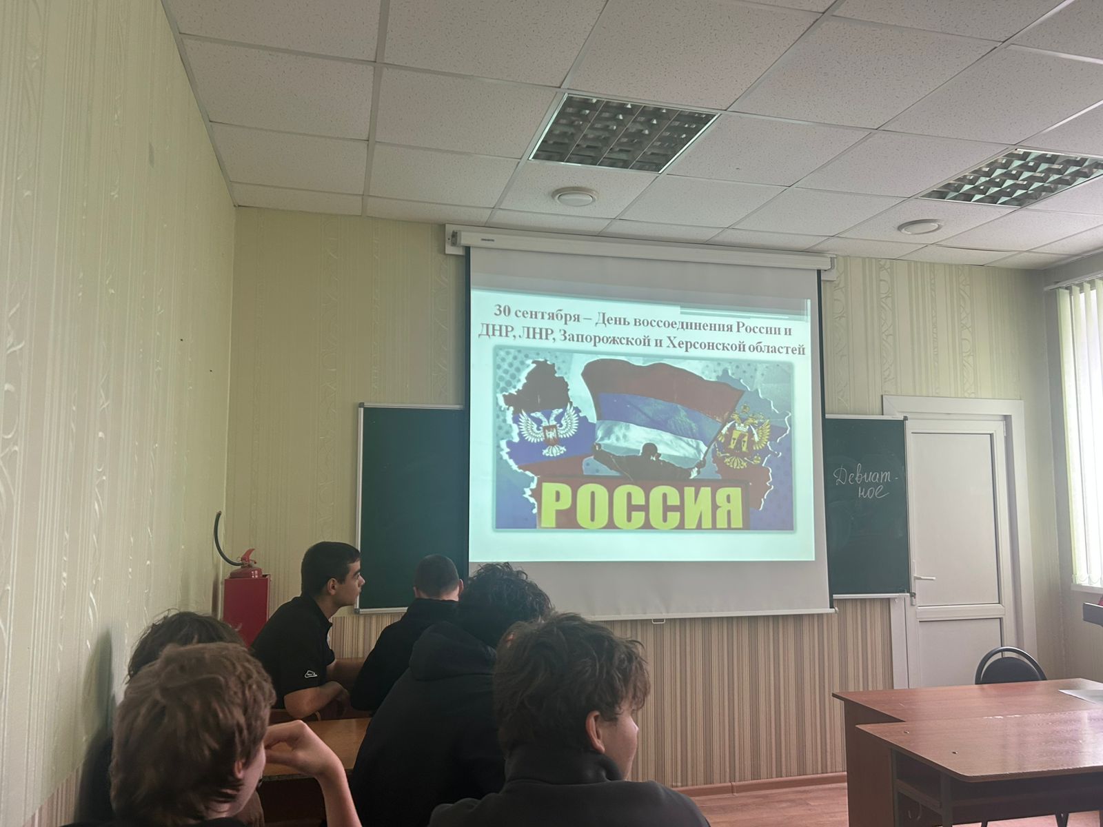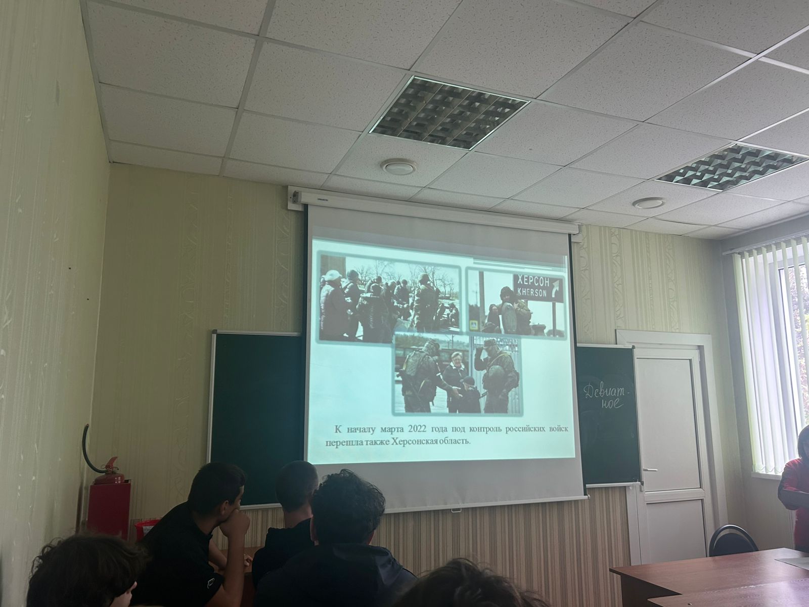 29 сентября в Буденновском филиале АНО ПО «Северо-Квказский академический колледж» был проведен патриотический классный час, посвященный годовщине вхождению ДНР, ЛНР, Запорожской и Херсонской областей в состав России.