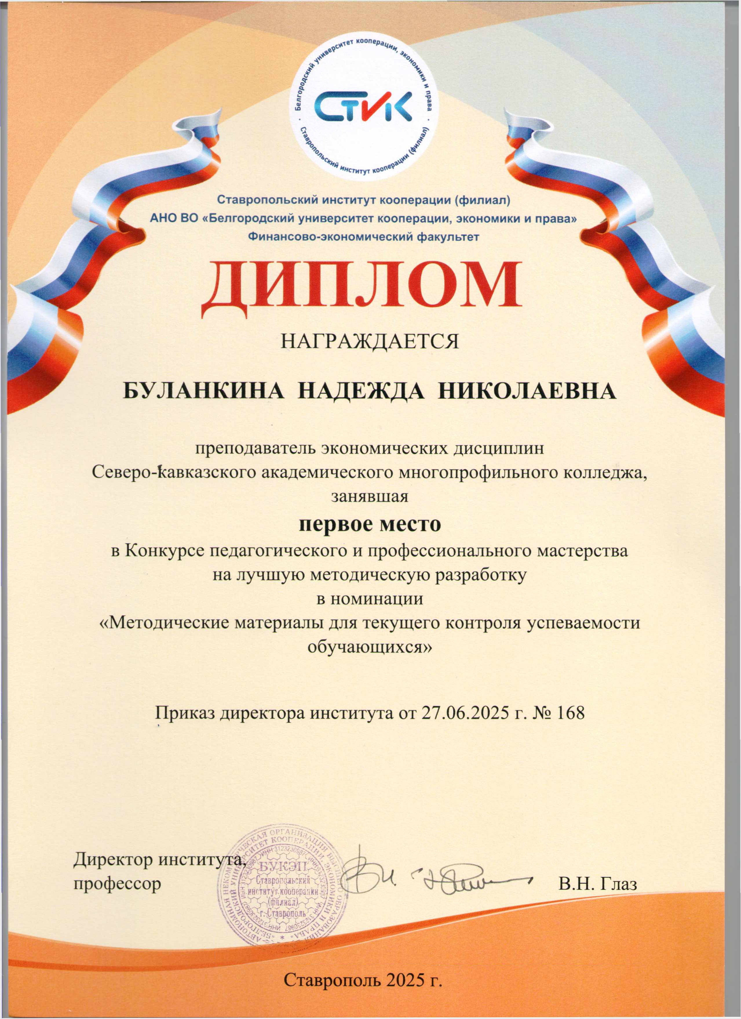 По итогам конкурса преподаватель экономических дисциплин АНО ПО «Северо-Кавказский академический многопрофильный колледж» Буланкина Надежда Николаевна заняла 1 место в номинации «Методические материалы для текущего контроля успеваемости обучающихся».